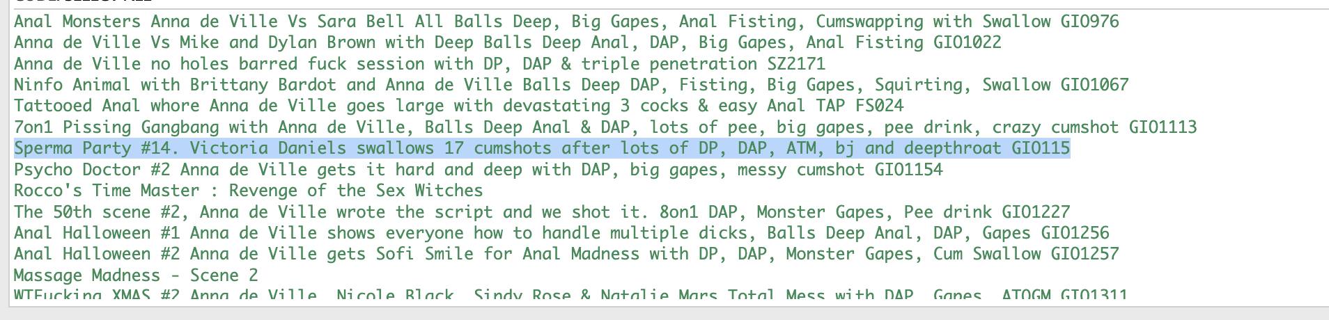 Jaxkbnm wrote:-Anna 25th Birthday #1wet, she drinks 25 shots of pee with, ATM, DAP, Extreme Deepthroat, Rough Sex, Big Gapes, Pee Drink (GIO2153)(no cumshot in part 1 scene)