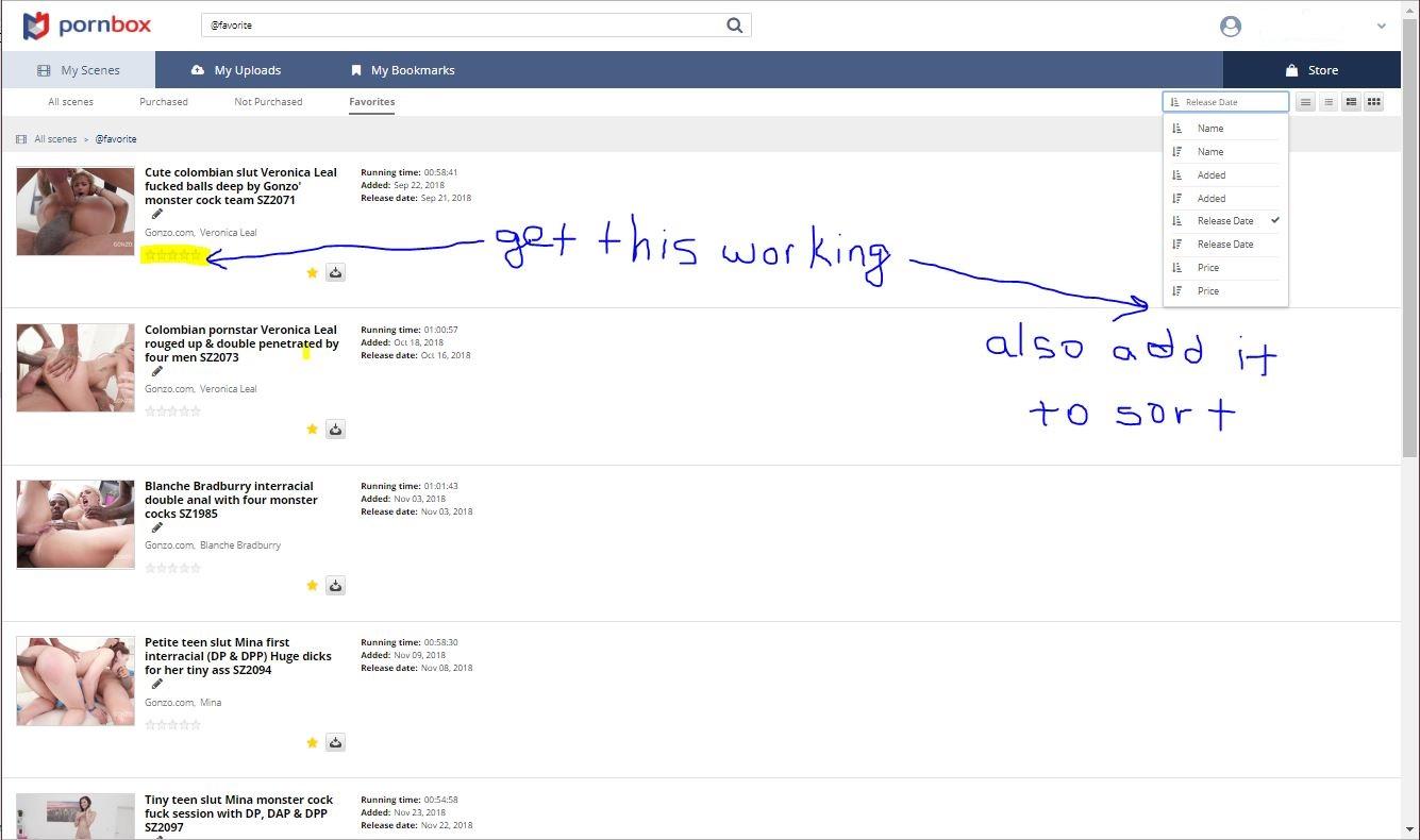 dpconnoisseur1 wrote:The current feature I like the most is tagging my favorite scenes under the "My Scenes" tab so I don't have to scroll through the hundreds if not thousands of scenes I have already purchase on LP. Now if you just activate the rating system and allow it to be sorted the Pornbox site will be complete. The 5 stars are already there I just can't select my personal rating of the scenes I already bought. I buy a lot of scenes even though I don't love many of them which would be illustrated in the partially enabled rating system.