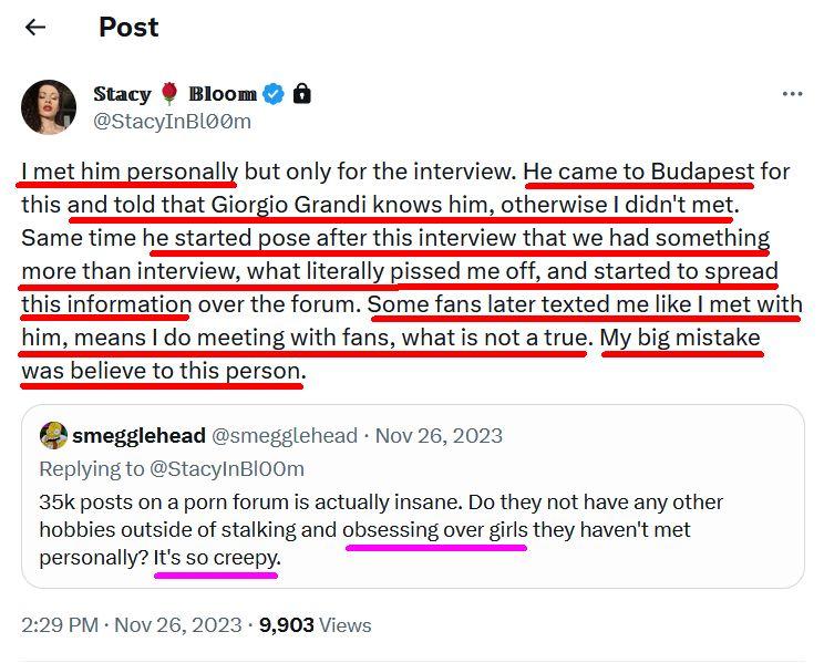 -suggesting and spreading rumours everywhere that stacy bloom might be an escort, implying that they did more than only an interview, and thereby hinting -according to stacy- towards other fans that he may have fucked her when they've met in Budapest. She got many escort request after this to her dismay.