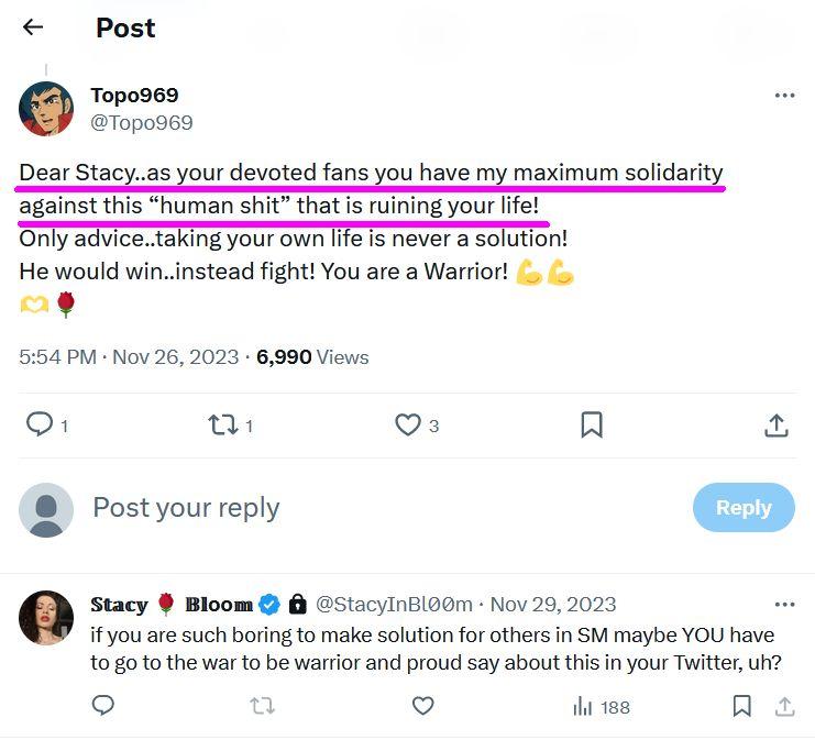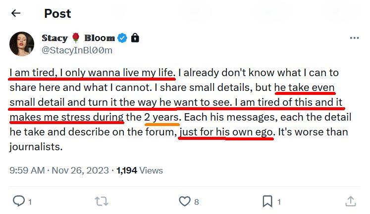 What are the next steps here? Did stacy go to the cops with these serious allegations like another fan on twit suggested (in case this alleged behavior hasn't stopped)? She surely must have archived all proof. Very sad situation all around. To anybody concerned, please stop bullying cute stacy bloom. She deserves to be treated like a human.