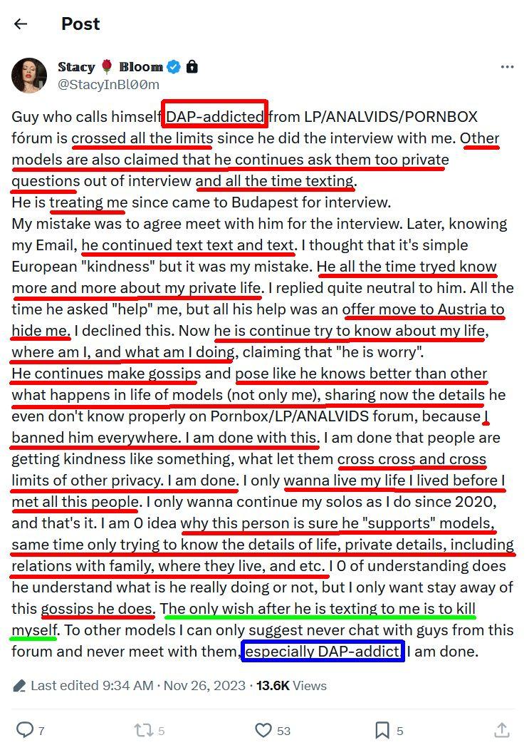 -suggesting and spreading rumours everywhere that stacy bloom might be an escort, implying that they did more than only an interview, and thereby hinting -according to stacy- towards other fans that he may have fucked her when they've met in Budapest. She got many escort request after this to her dismay.
