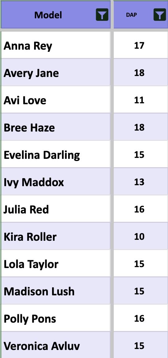 pronossstat wrote:Well, if we are talking about retired girls (inactive in studio porn for more than a year) with 10-19 DAPs, here is my list