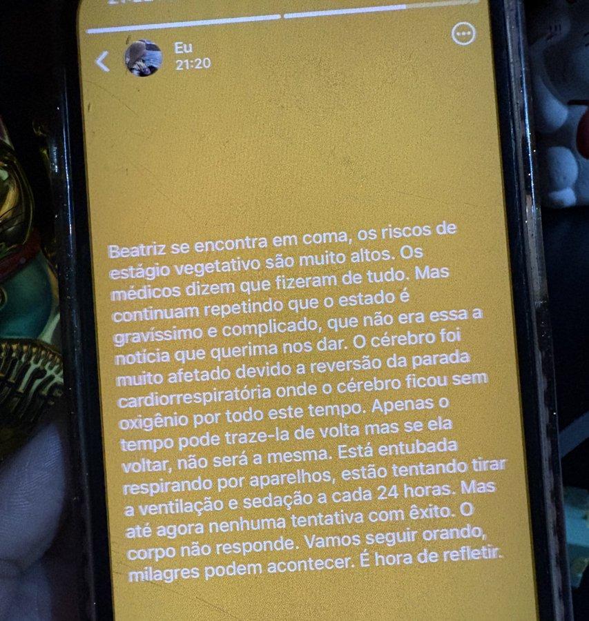 "Beatriz is in a coma; the risk of becoming a vegetative state is very high. The doctors say they've done everything they can. But they keep repeating that her condition is extremely serious and complicated, that this wasn't the news we wanted to share. Her brain was severely damaged due to the reversal of the cardiopulmonary arrest, in which her brain was deprived of oxygen for all that time. Only time can bring her back, but if she does, she won't be the same. She's intubated and on a ventilator; they're trying to remove the sedation and ventilation every 24 hours. But so far, no attempt has been successful. Her body isn't responding. Let's keep praying; miracles can happen. It's time to reflect."