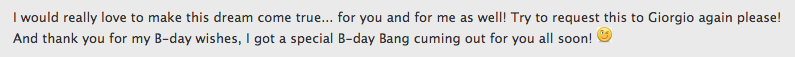 Not to forget: Better too late than never, I wish you only the best for your birthday. It seems your happy birthday was a happy fuckday, too. :D