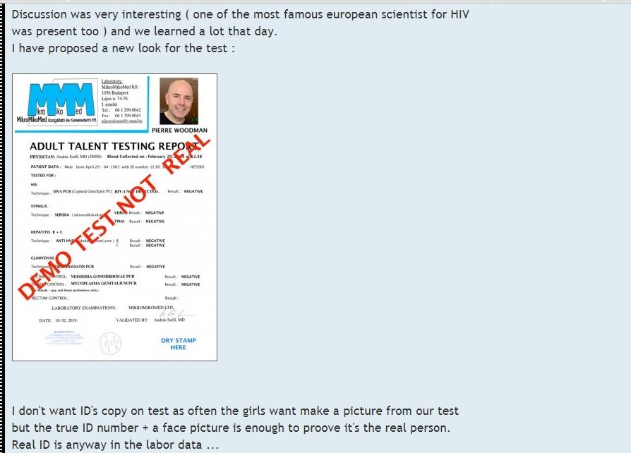 Ok. but why I post this here it is because just come to ny nind, this guy PeeWee soon will have to pay a lot if people will realize to send him first the models for an interview. The model only has to be clever telling wnt to work for him, and he will escort the model to the lab pay the lab test, and when the result she will get, can just say No to Woodman, and go work for other productions. *) New models will never have the money to pay for a test (700Euro ), but PW will have