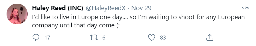 Based on what Haley posted on her Twitter on 29 November 2020 (shown below) this HAS to be the absolute best time to get Haley to shoot scenes in Prague. In addition to it being the best time it's also the best circumstances because Haley doesn't have an agent (no middleman) and is doing self-booking via her Twitter account. Now can we FINALLY make this happen? Feel free to repost or reference this post in any appropriate thread at LP.