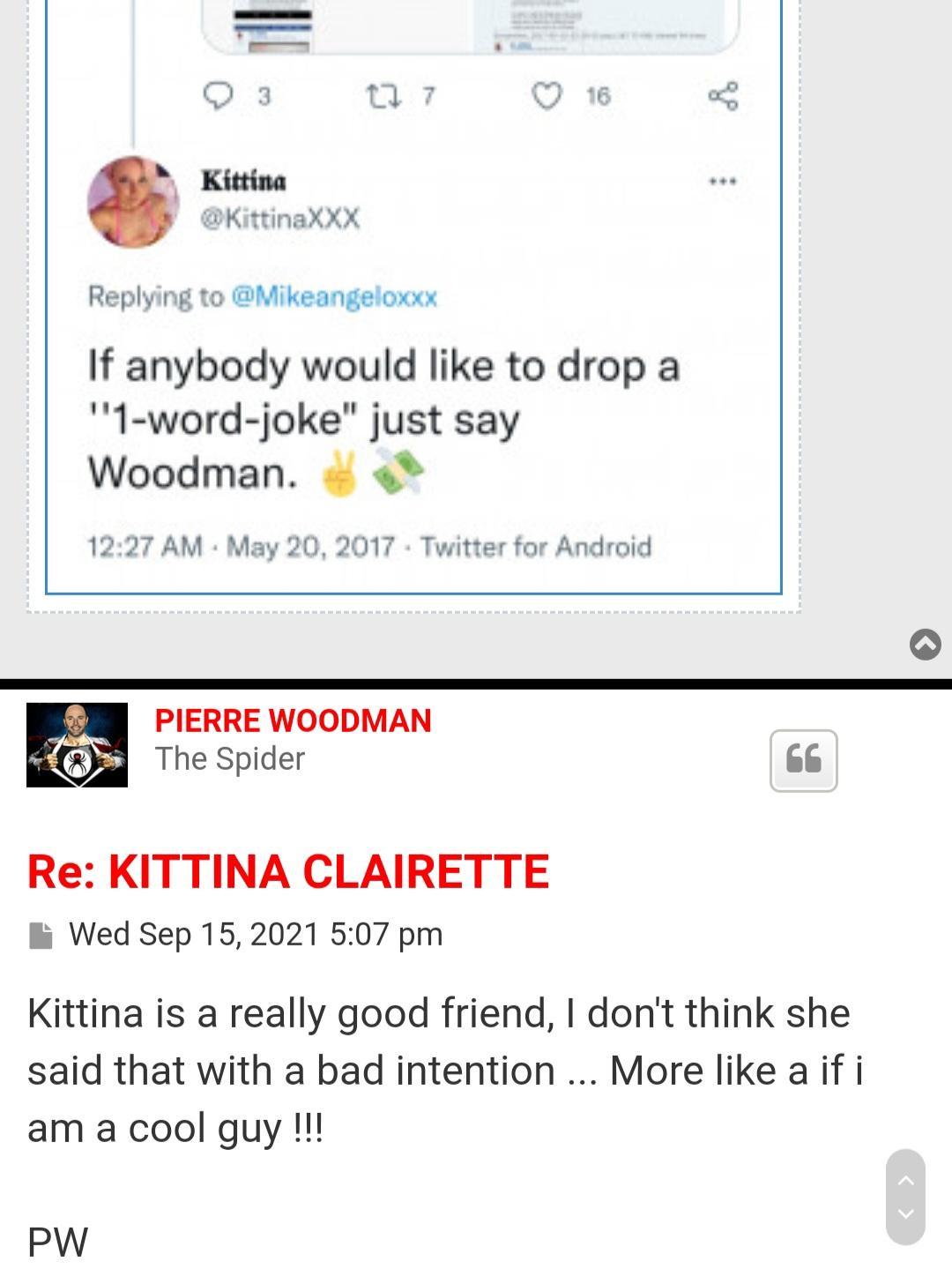 It's funny how all these girls who spoke bad about PW in the past is suddenly in the good books with him again. He either blackmails or pays them shit load of money. Latest post on his forum is about Kittina who once made fun of Woodman calling him a joke and poking fun at him,something which he stupidly interpreted as her saying something 'good' about him, when it was actually Kittina talking trash about him lol. But due to his French, he never understood the jibe that she chimed in on after Mike Angelo exposed him with Cayein Klein.He went as far as to ask her about Kittina about the incident and we all know ehat happened next, he threatened Kittina to the point he asked her to post a picture on [spam] to 'prove' he is a good man lololol. Why would she randomly post a pic on [spam] to say she is a Woodman girl.