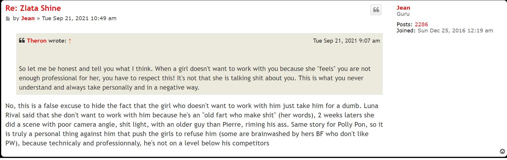 He once said if a girl declines to work with him it's not a problem, but to decline without even an interview and getting to know him is his real problem. I find this so hypocritical because when Zlata declined him, he starts to slander her. All this btw without an interview or getting to know her himself, yet he says how she is not pretty or a good sympathetic girl as if he knows her. I think she made the right decision not working with this man because any man who can talk so bad things about a model and make her feel ugly and horrible without even knowing her, is a man that nobody should work. PW showing his true colors when he doesn't get his way. A girl doesn't work with him and then suddenly he tells how ugly and bad she is. What a fucking asshole!!! He does this with all the girls. Kiara Lord, Romy Indy etc how many girls he talked shit about and 5 years later they are in his studio and him telling how adorable she is lol but on your forum you forgot how much nonsense you was speaking. He is a total dirtbag!!!