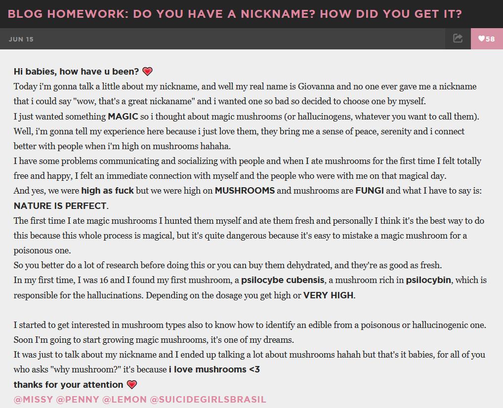 She is a "suicide girl". They are known to be alternative, tattooed, and love soft drugs like smoking pot and snacking psychedelic hallucinatory cakes and mushrooms: https://en.wikipedia.org/wiki/Psilocybin_mushroom hence the last name.
