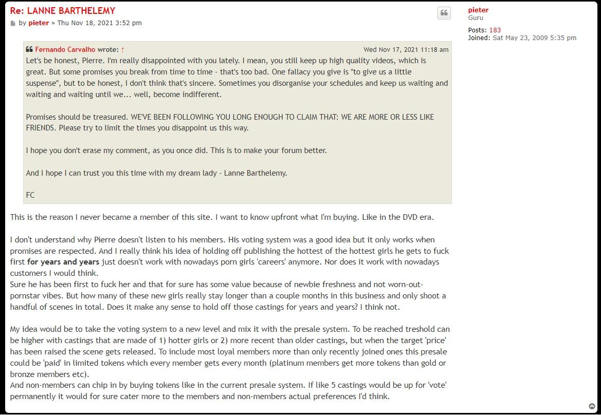 The girls aren't the problem here, and although I greatly respect both of you Blue and Valencia for the knowledge of the industry that a lot of us here don't have, I really believe that it is doing more harm to our argument commenting on the models who CHOOSE to work with Woodman. Believe it or not, there are women who will enjoy working with Pierre whether they know of his track record or not. It's not up to us to chastise them for doing that, they aren't - or shouldn't be the focus of our attention. We should be concentrating on alerting the new models and members who are not aware of this deceitful and dishonest man, not discrediting ones who've made the choice to work with him.