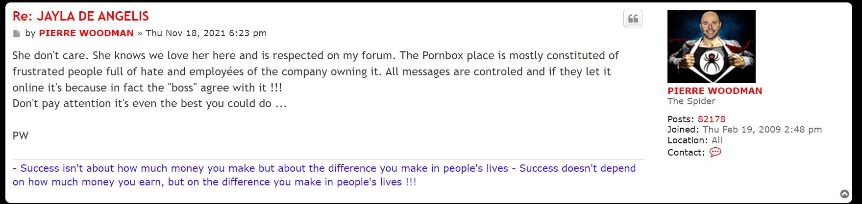 Of course Valencia hates her so much and whatever Jayla de Angelis does valencia will find a reason to talk bad about her if she did really crazy hardcore scene he would obviously say some shit again I don’t know why you just don’t change the topic there are millions of girls Pierre Woodman meets with but valencia has to keep on talking about a girl who is less friend with Pierre Woodman he wish he could spend his time with her “lololol” I suggest to stop hating so much the models who just say what they want and will not shut their mouth - I like it it says that a girl is strong