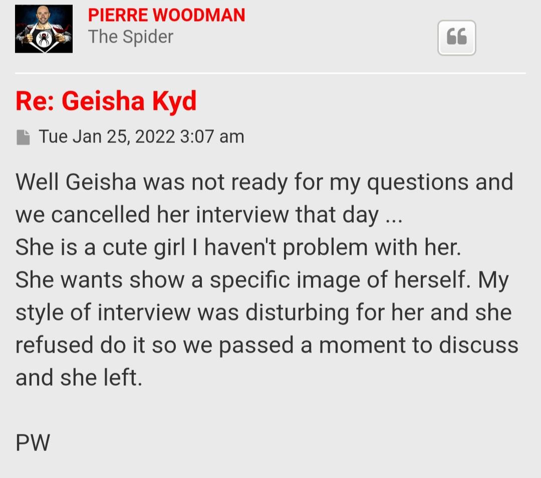 Why would Geisha Kyd show up for an interview and then leave with doing it???....obviously he told her what questions he was going to ask her and how she should respond before the interview happened. This is what he does and hiw he stages and tells them to lie about certain things in his interviews. Recently a girl started porn with an interracial scene. She confirmed it was her first scene ever and Pierre was the 2nd scene. The golden shower was even her 2nd with PW but he advertised it as his 1st and pushed the date back earlier than she had arrived to even meet him. She said that Pierre had asked her to lie before the interview. So when the interview happened and he asked if she tries a black man, she lied and said she didn't, and he convenient told her well I'm sure you will try black man there are plenty in this industry(meanwhile she had already done her first scene with a black man with golden shower)I will not name her but I'm sure you guys will figure it out.